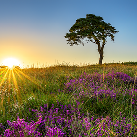 A peaceful sunrise at Blagdon Lake showing a silhouetted treeline and birds flying against a gradient sky of orange, pink, and deep violet.A coastal sunset view looking towrds Gruinard bay in the Scottish Highlands showing rugged rocks in the foreground and pink clouds above distant snowy mountains.