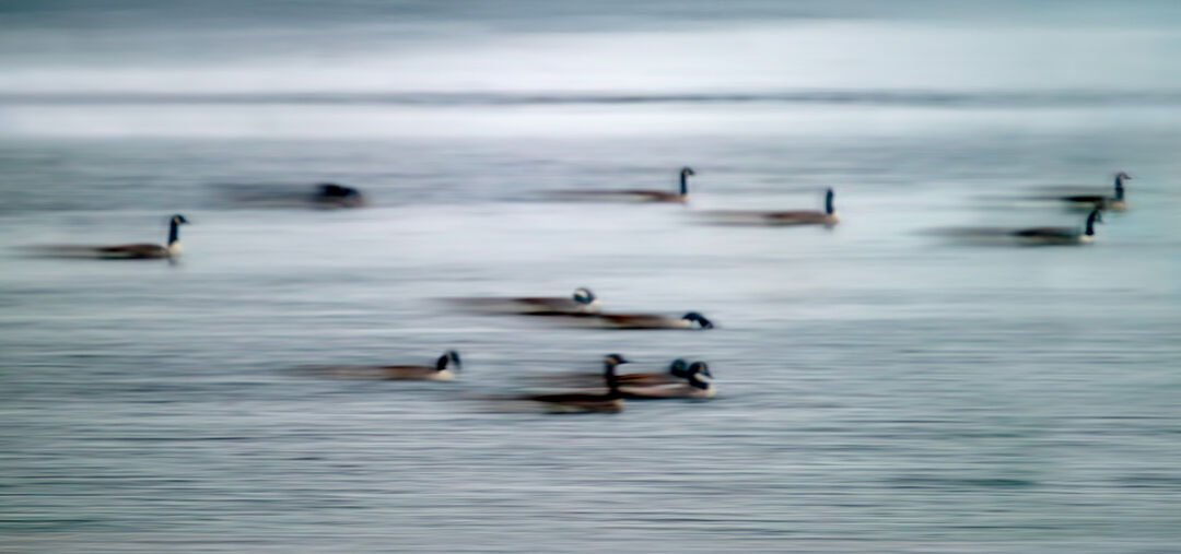 A creative ICM (intentional camera movement) photograph of Canada Geese drifting across the lake, blending movement and stillness in a serene composition.