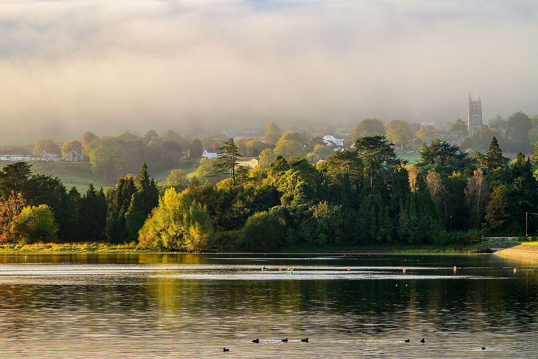 Rolling mist coming down the hills in autumn, with trees sunlit by the early morning sun on the shores of Blagdon lake. Such a tranquil scene.