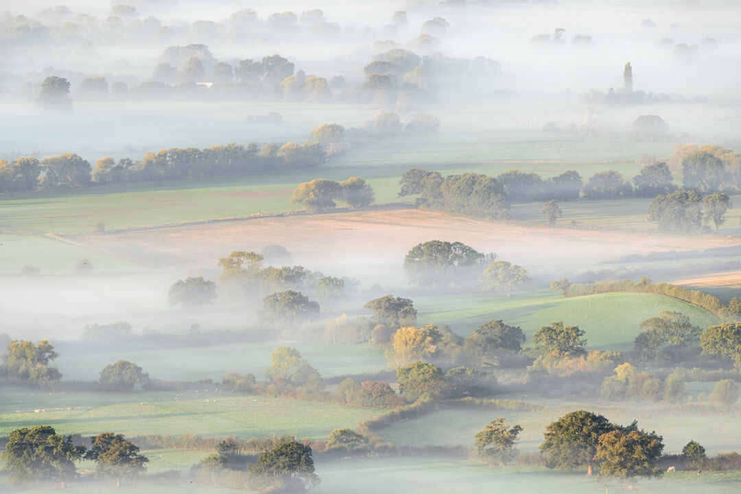 MISTY SOMERSET LANDSCAPE AT FIRST LIGHT - Soft layers of mist drift across the Somerset levels at sunrise, revealing trees and hedgerows in gentle light.