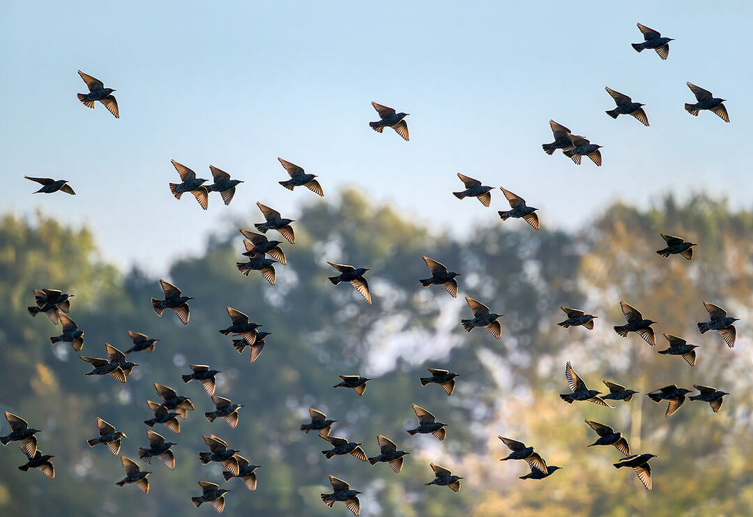 SUNLIT STARLINGS IN EARLY MORNING FLIGHT