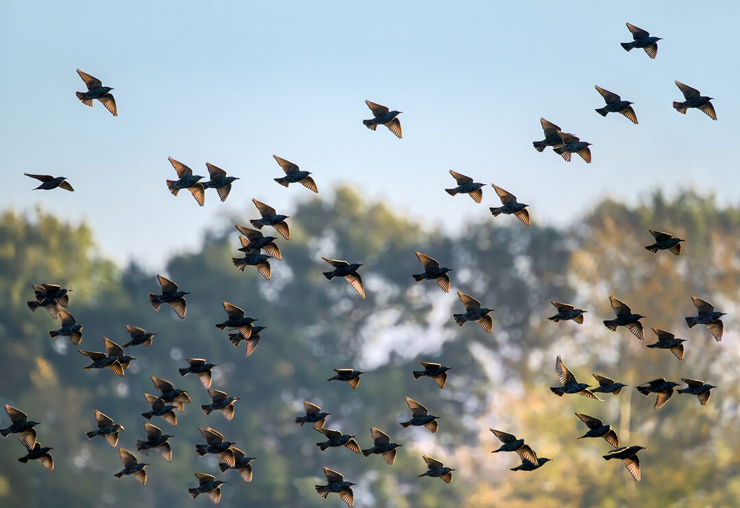 SUNLIT STARLINGS IN EARLY MORNING FLIGHT - A flock of starlings sweeps across the sky, their wings glowing in soft morning sun.