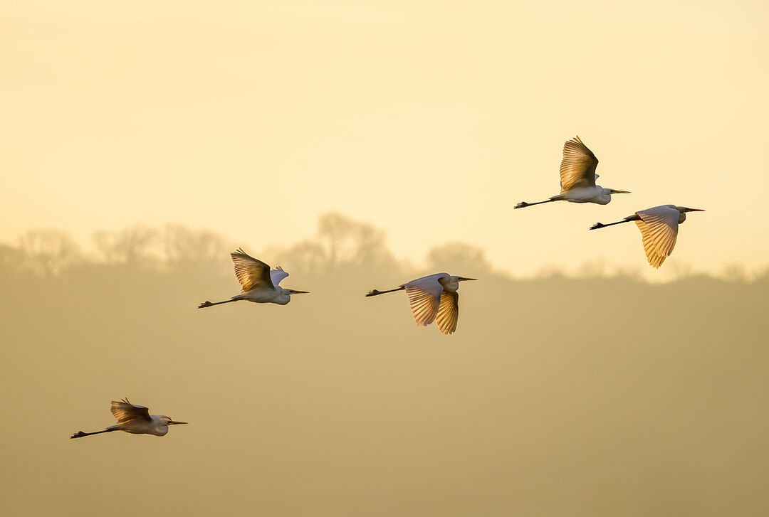 Such graceful birds in flight - effortlessly flying with the sunlight catching their wings at sunrise.
