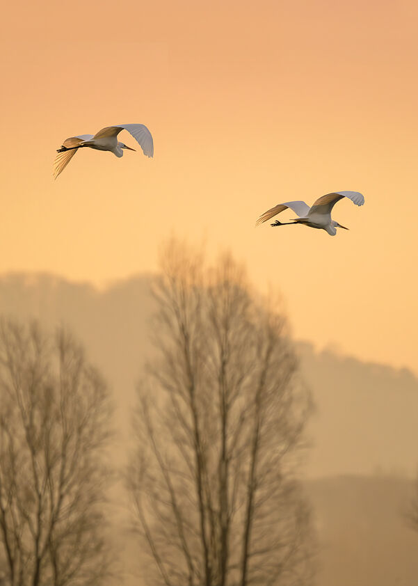 GREAT WHITE EGRETS AT SUNRISE - such graceful birds in flight.