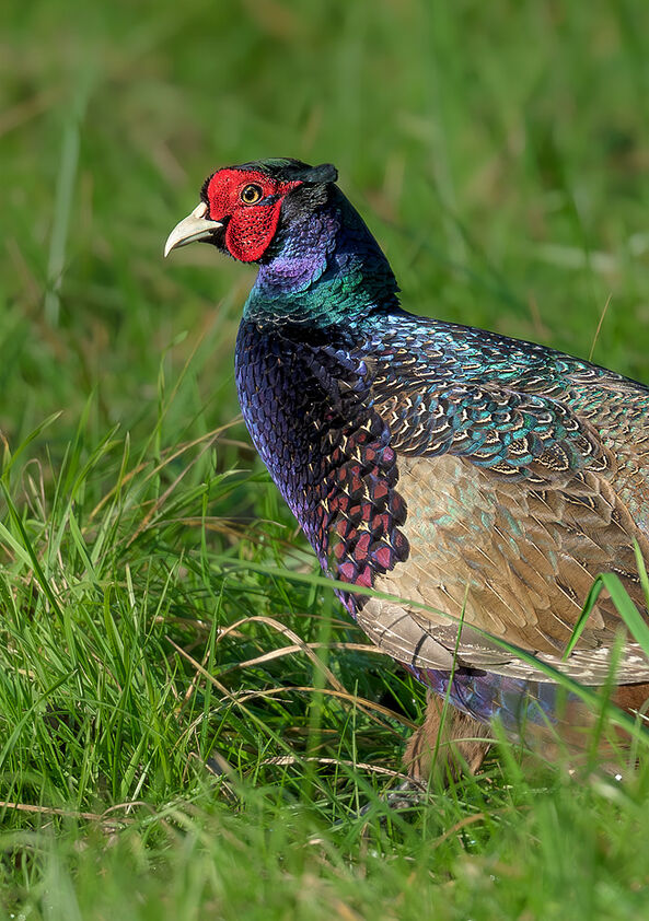 MALE PHEASANT SHOWING STRIKING IRIDESCENT PLUMAGE AT BLAGDON LAKE - An elegant male pheasant pauses in the grass at Blagdon Lake, its vivid feathers catching the light and showing beautiful detail throughout.
