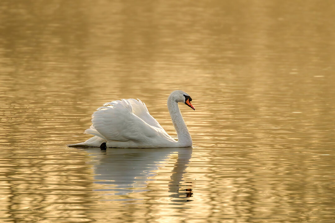 MUTE SWAN GLIDING GRACEFULLY ON GOLDEN WATER AT SUNRISE - A quiet moment of beauty and calm.